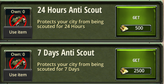 24H / 7 Days Anti Scout - this item protects your Base from being scouted. This also works on tiles.